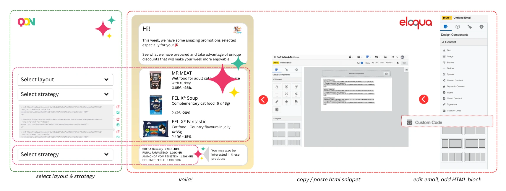 Integrating Quarticon’a product blocks into your Eloqua email campaigns is a proven way to increase conversions and enable automated product offering in Eloqua e-mails. Whether you’re running a sale, launching new products, or sending reminders, up-to-date and personalized product makes your emails more engaging and action-driven.